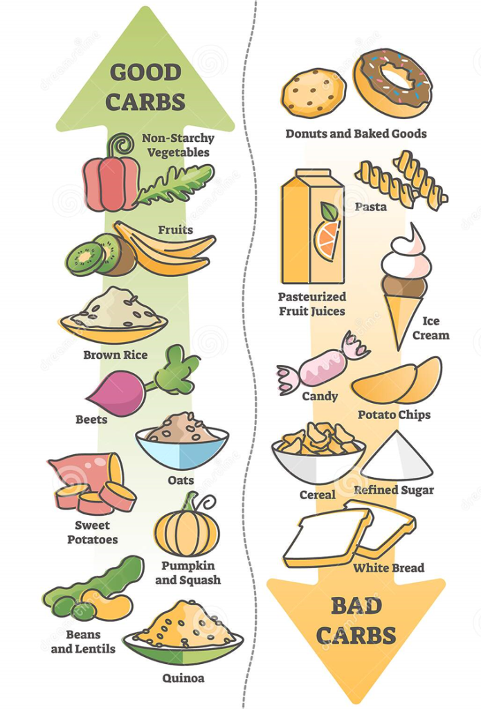 You sometimes hear people refer to different carbs as being ‘good’ or ‘bad.’ What they’re trying to say is that the good carbohydrate sources are those that are the least processed – foods like whole fruits, vegetables, dairy products, beans and whole grains. The other reason these products are good is that they provide more than just energy to the body. There are also vitamins and minerals tagging along. And in the case of fruits, vegetables, beans and grains, we also pick up some fibre and antioxidants.